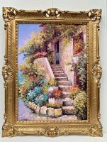Bild mit Rahmen Blumen Steinhaus 90cm Dorf Italien Gemälde Wandbild Barock Antik